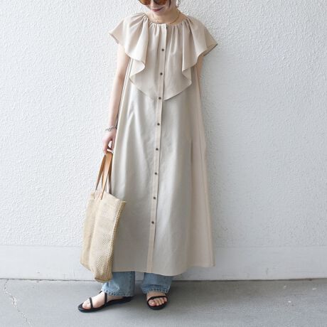 顔まわりを華やかに演出する大きめのフリルは、肩を包み込むようなシルエットで、気になる二の腕をさりげなくカバーしてくれます。