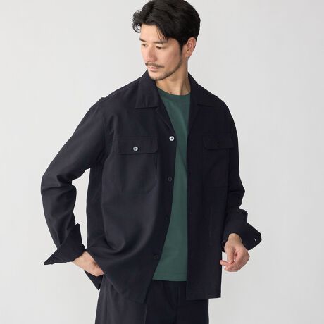 リラックス感のある襟デザインとゆったりとしたフィッティングが特徴のダブルポケットオープンカラーシャツです。