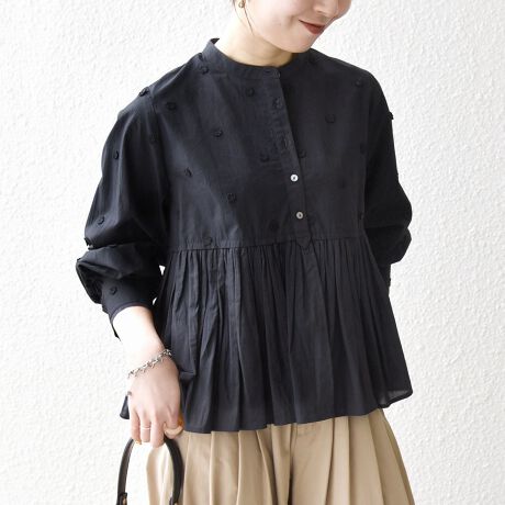 小さなお花のモチーフが散りばめられたペプラムシャツブラウス。