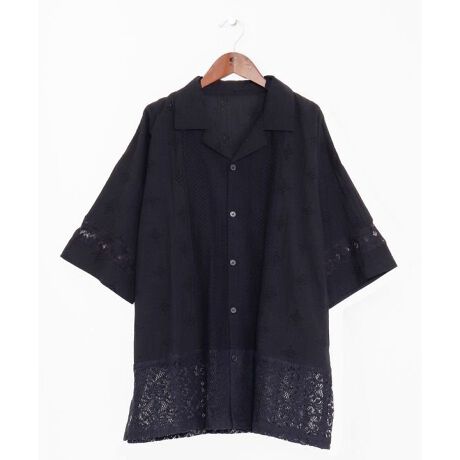 [型番:IAC-6157-2026]3種のレース生地と総柄刺しゅう生地を組み合わせた開襟シャツ。クラフト感あふれる切り替えデザインで涼しく着られる。