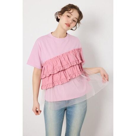 ■ポイント存在感のあるチュールフリルが目をひくトップスです。着るだけで、コーディネート全体を華やかに明るく見せてくれます。■ディテールシンプルなTシャツのボディにフリルを斜めにあしらったドッキングカットソーです。■スタイリングカジュアルにもきれい目にも映えるトップスなので、シンプルなボトムと合わせるだけでコーディネートが完成します。■生地撚糸仕様で表面変化系の天竺素材。カサカサとした肌触りが特徴です。■透け感:ややあり■裏 地:なし■伸縮性:ややあり■光沢感:なし※お取り扱い上のご注意・素材の特性上色落ちする場合があります。・クリーニング、着用時に他の衣類や雑貨類に色移りする事があります。・湿った状態で重ねて放置すると色移りの原因となりますので注意してください。・チュール部分、ひっかけに注意してください。[注意事項]※画像の商品はサンプルです。実際の商品と仕様、加工が若干異なる場合があります。※画像の商品は光の照射や角度、お使いのモニター環境により、実物と色味が異なる場合がございます。※着用、お取り扱いの際は、アテンションタグをご確認ください。
