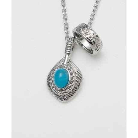 [型番:4KXZ6706-2026]ターコイズカラーのストーンが印象的なネックレス。繊細なフェザーモチーフと組み合わせ、胸元にハワイの海を思わせる爽やかな輝きを添えます。シンプルなコーディネートのアクセントにおすすめです。