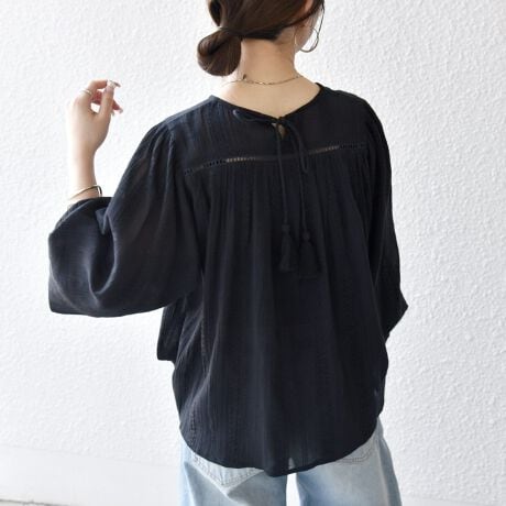 袖口はゴム仕様で、たくし上げると程よいボリュームが生まれ、女性らしい着こなしが楽しめます。