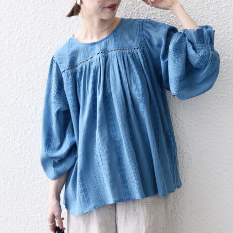フロントヨークにハシゴレースをあしらった、クルーネックブラウス。