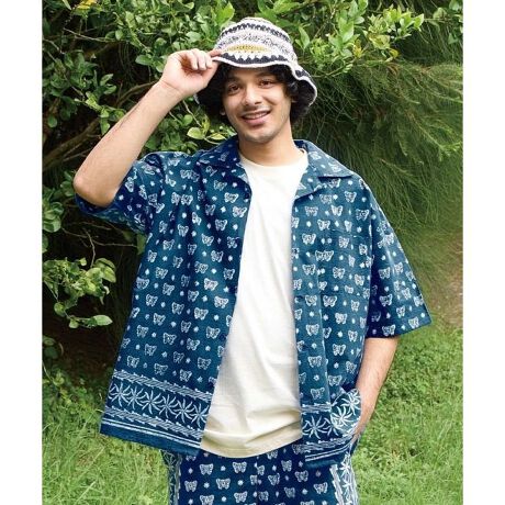 [型番:IDS-6121-2026]藍色が映えるブロックプリントの開襟シャツ。ゆったりオーバーサイズでリラックス感抜群。インドの職人技が光る上品な一枚。