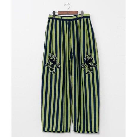 [型番:IAC-6138-2026]メキシコのカラフルな文化にインスパイアされたストライプ柄パンツ。アンブレラスカイを連想させる配色と、オトミ族の刺しゅうモチーフが魅力。風通しの良いインド綿素材で、快適な履き心地のテーパードシルエット。