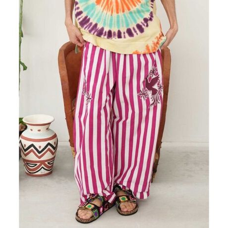 [型番:IAC-6138-2026]メキシコのカラフルな文化にインスパイアされたストライプ柄パンツ。アンブレラスカイを連想させる配色と、オトミ族の刺しゅうモチーフが魅力。風通しの良いインド綿素材で、快適な履き心地のテーパードシルエット。