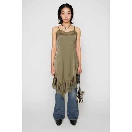 ■POINT:シンプルながらも存在感のあるワンピース。アシンメトリーな裾とフリル感のあるディテールを組み合わせたのがポイント。■DETAIL:程よく光沢感のあるサテン素材が、女性らしい印象を演出。タイトすぎず、ロングTシャツやシャツなどインナーに入れて着用して頂けます。■STYLING:一枚で着用するのは勿論、デニムなどでレイヤードしたスタイリングもオススメです。■透け感:なし■光沢感:あり■伸縮性:レース部分のみあり■裏 地:なし※本品は素材の特性上色落ちします。洗濯、クリーニング、着用(使用)時に他の衣類や雑貨、家具類に色移りする事があります。特に汗や雨等で湿った状態では、色落ちが顕著になります。白、淡色との組み合わせは避け、お取り扱いには十分ご注意下さい。