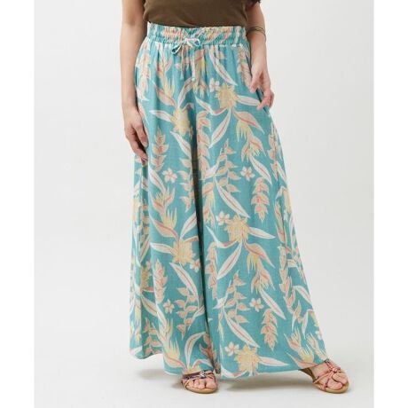 [型番:42O-6105-2026]レーヨン麻素材のフレアパンツ。軽やかで通気性に優れ、汗ばむ季節にもさらっと快適。ヴィンテージ風のボタニカル柄が印象的で、ウエストはゴムと紐でサイズ調整可能。便利なポケット付きです。