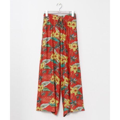 [型番:42O-6105-2026]レーヨン麻素材のフレアパンツ。軽やかで通気性に優れ、汗ばむ季節にもさらっと快適。ヴィンテージ風のボタニカル柄が印象的で、ウエストはゴムと紐でサイズ調整可能。便利なポケット付きです。