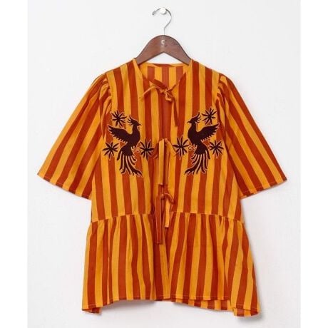 [型番:IAC-6135-2026]鮮やかなストライプとオトミ族の刺しゅうが印象的なブラウス。通気性の良いインド綿素材で、羽織としても活躍。前開き仕様で着回し自在、女性らしいシルエットを演出する万能トップス。