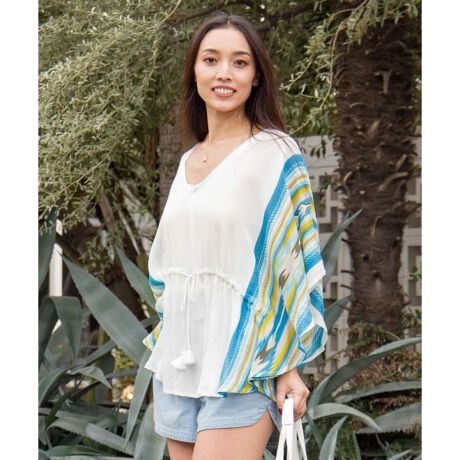 [型番:4IA-6107-2026]軽やかなレーヨン素材で涼しく快適に着られるUVカットトップス。鮮やかなカラーがハワイを思わせ、ウエストを絞ることでシルエットの変化も楽しめる、リゾート感のある一枚です。UVカット加工
