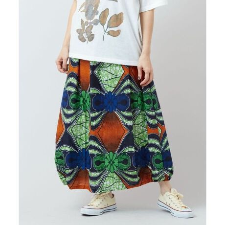 【タイ直輸入】コクーンシルエットのスカート。アフリカンファブリックから着想を得た総柄デザイン。サイドはゴム入りで立体感あるフォルムに。張りのある素材でシンプルなトップスとの相性も抜群。