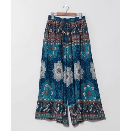 [型番:IDS-6130-2026]インド綿のさらっとした質感に大胆な曼荼羅プリントが映えるワイドパンツ。裏地付きで安心感あり。メタル付き外紐がアクセント。
