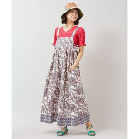 [型番:IAC-6150-2026]肩紐調整可能なサロペット型にペイズリー柄をプリント。風通しの良いインド綿素材で、涼しく着られるリラクシーなデザイン。