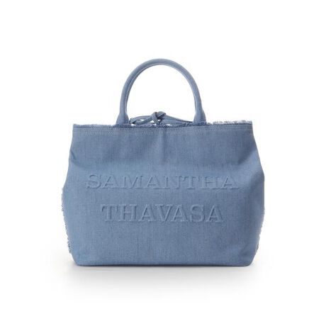 ◇Samantha Thavasa(サマンサタバサ)のリングムラ糸デニムバッグ爽やかなカラーリングのデニムバッグ。【デザイン】リングムラ糸デニムをつかった滑らかな素材感に立体的なロゴとフリンジ加工がポイントのアイテム。バッグのサイドにはスナップボタンがついているのでちょっとしたフォルムチャンジができます。内装はポケット付きのざっくりと収納ができるタイプでA4サイズも楽々収納ができる収納上手な仕様。シンプルでありながら洗練されたデザインで様々なライフワークに寄り添えるバッグです。【素材】リングムラ糸デニムを使用しています。【サイズ感】長財布…〇、A4…〇