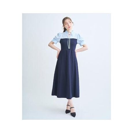 【クラシカルで好印象な大人かわいいスタイルを作り出す、ニットドッキングワンピース】【Point】・配色デザインが目を惹く、ドッキングワンピース。胸元から上はやわらかな布帛素材、胸下からはニット素材で切り替え、上品さと着心地の良さを両立しました。・リボンタイとさりげないフリルネックが、クラシカルで女性らしい印象を演出。顔まわりを華やかに見せてくれます。・胸下から広がるニット素材のスカート部分は、程よくフィットしながら美しいフレアシルエットに。縦のラインを強調し、自然なスタイルアップを叶えます。・一枚でコーディネートが完成する主役ワンピース。デイリーからお食事シーンまで幅広く活躍します。ケア方法:ドライクリーニング透け感:なし裏地:なし伸縮性:あり光沢感:なし生地の厚さ:中肉