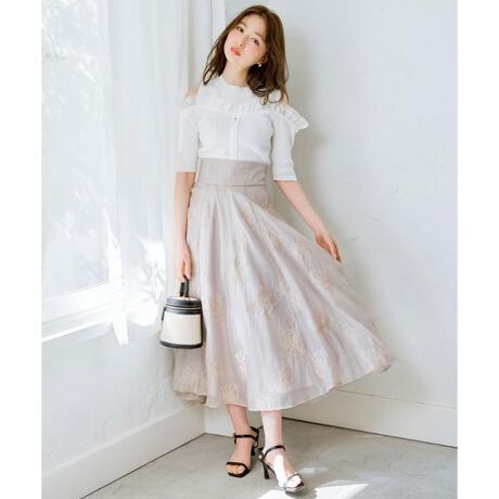 繊細な刺繍が華やかさを添えるフラワー刺繍シアースカート【Design】・フラワー刺繍をあしらったシアー素材が軽やかでフェミニンな印象を与えるスカート。・ふんわり広がるシルエットで、女性らしい着こなしを演出。・動くたびにふんわり揺れ、コーディネートに軽やかさをプラス♪・ブラウスやニット合わせで上品なフェミニンスタイルが楽しめます◎・ウエストバックはゴム&レースアップ仕様でサイズ感の調整が可能。・左ファスナー仕様・裏地付き【Fabric】・軽やかなシアー素材にフラワー刺繍を施したデザイン。・ホワイト、ベージュ、ピンクの3色展開となります。【Care】ドライクリーニング