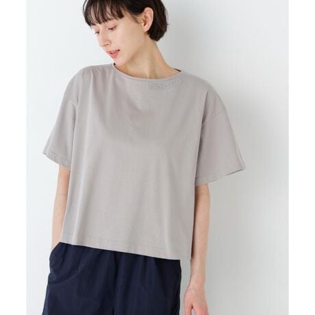 袖と裾にフレアーをつけたデザインTシャツ。衿元に「Bonjour」を刺繍した刺繍モチーフを縫い付けたワンポイントTシャツです。