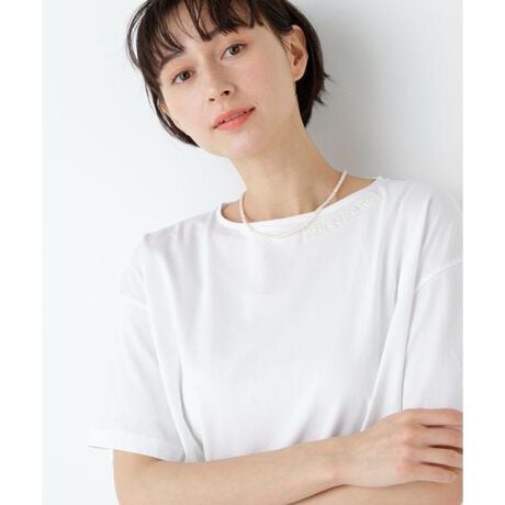 袖と裾にフレアーをつけたデザインTシャツ。衿元に「Bonjour」を刺繍した刺繍モチーフを縫い付けたワンポイントTシャツです。
