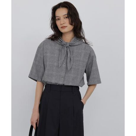 リラックス感のある5分袖のスカーフ付きリネンシャツです。小さめな丸衿がポイント。三角スカーフが今年らしい印象でスタイリングにアクセントを添えます。