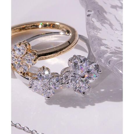 存在感のあるクローバーモチーフが上品なリングです。丁寧にセッティングされたジルコニアがきらめきを放ち品のある2連のクローバーモチーフでどんなコーデにもマッチします。【Cubicシリーズ】Cubicジルコニアはダイヤモンドに極めて近い輝きをもつ人工石でダイヤのように多数のカットを施す事でより繊細で強い輝きをはなちます。Cubicシリーズはグレーのボックスとショッパーが付属しております。※撮影時照明の関係により、色味が違って見える場合がございます。またパソコン・スマートフォンなどの環境により、若干製品と画像のカラーが異なる場合もございます。予めご了承ください。商品の色味は、商品単品画像をご参照下さい。※商品画像はサンプルのため、色味やサイズ等の仕様に変更がある場合がございますので、予めご了承ください。