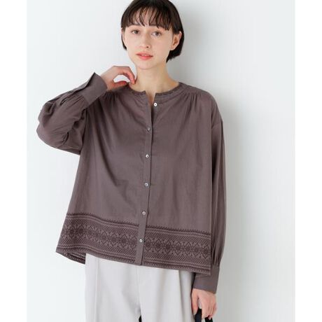 ニュアンスある風合いのインド刺繍ノーカラーブラウス