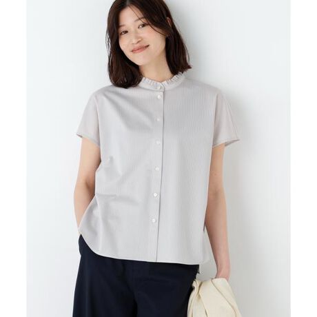 フレンチスリーブのスタンドフリルブラウスをジャージー素材で作ったデザインブラウスです。