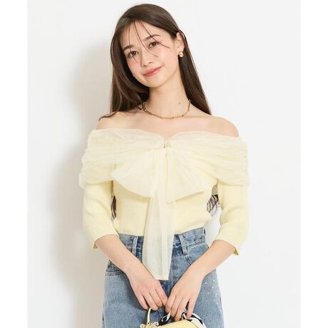 繊細なレイヤードが映えるリボンチュールレイヤードリブニット【Design】・リブニットにチュールを重ねたレイヤードデザインが目を惹くトップス。・ふんわりとしたチュールとリボンディテールが、フェミニンな印象をプラスします◎・程よくフィット感のあるリブシルエットで、すっきりと女性らしいラインに♪・伸縮性のある襟ぐりで、オフショルダーとしても心地よくフィットします◎・前後どちらでも着用できる2WAYデザインで、スタイリングの幅が広がるのも魅力♪・スカートにもパンツにも合わせやすく、幅広いスタイリングで活躍します!・被り仕様【Fabric】・伸縮性のあるリブニット素材で、快適な着心地に。・やわらかく肌なじみの良い風合いで、ストレスフリーに着用いただけます。・ホワイト、イエロー、サックス、ブラックの4色展開となります。【Care】ドライクリーニング