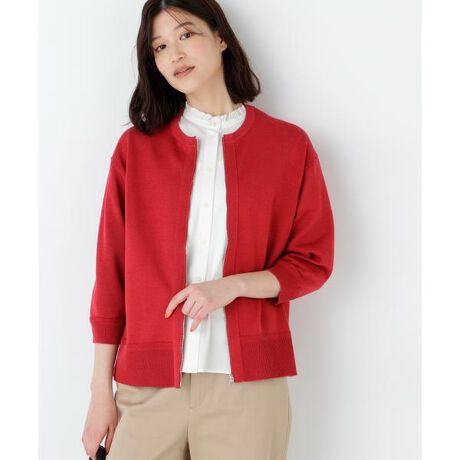 ジップアップブルゾン風の7分袖カーディガンです。素材感を活かしたシンプルなシルエットで前中心のジップがアクセントになります。