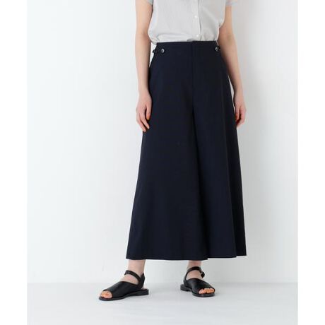 マリン風の釦が効いたデザインのスカーチョです。脇の細目ミニベルトでウェストを絞ることもできます。ウェスト周りディテールはありますがすっきりしたサイズ感で作ってあります。