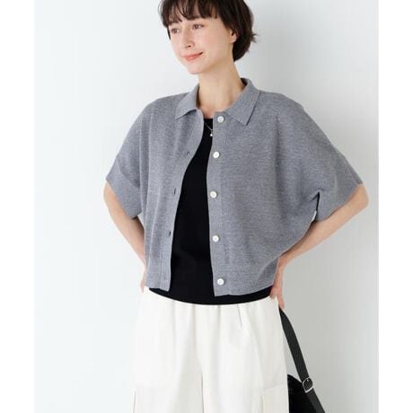 ショート丈のポンチョのようなシルエットのポロカーディガンです。ゆったりバランスなので肌離れがいいですが、裾リブのサイズ感が丁度腰にフィットするのでルーズすぎず収まりのいいデザインです。