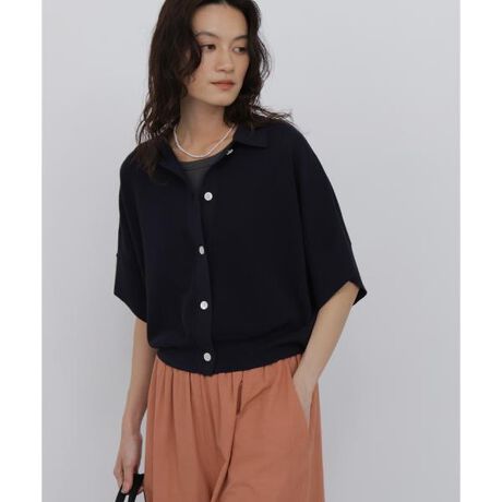 ショート丈のポンチョのようなシルエットのポロカーディガンです。ゆったりバランスなので肌離れがいいですが、裾リブのサイズ感が丁度腰にフィットするのでルーズすぎず収まりのいいデザインです。