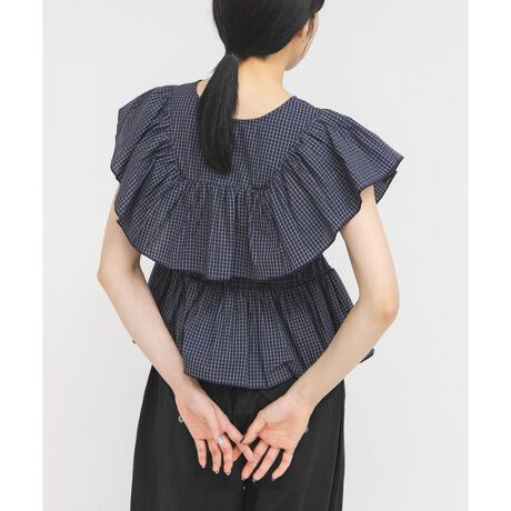 華やかなフリルがボリューム感たっぷりでどこから見ても可愛いブラウス。身頃はシャーリングを施しており、程よくゆとりがありつつもすっきりとした着こなしができます。フロントはホック仕様にすることでモードさもプラスしました。自然と華奢見えが叶う絶妙なバランスにもこだわりました。