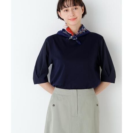 きれい目な印象の1枚着カットソー。身頃はシンプルながら、袖に麻調の布帛素材を使用。肘の隠れる袖感と、袖口のタックがポイントです。身頃がカットソーで着心地抜群ながら、きちんと見えする万能アイテムです。