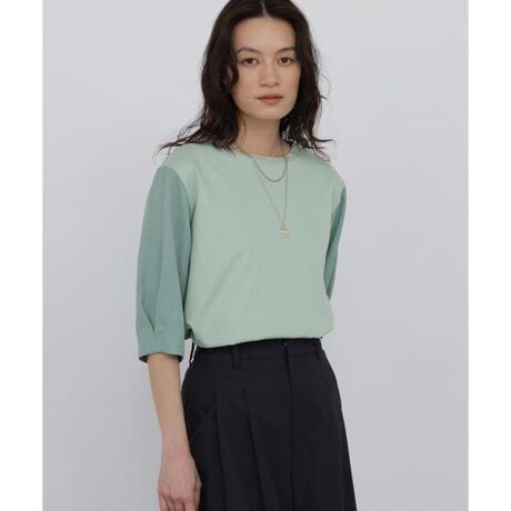 きれい目な印象の1枚着カットソー。身頃はシンプルながら、袖に麻調の布帛素材を使用。肘の隠れる袖感と、袖口のタックがポイントです。身頃がカットソーで着心地抜群ながら、きちんと見えする万能アイテムです。