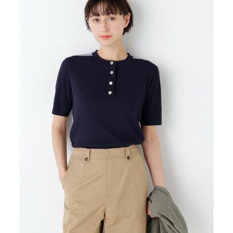 前身頃と袖がワイドリブ、後ろ身頃が天竺の編地コンビのヘンリーネックプルオーバーです。バイカラーでアクセントを付けました。トレンドを意識したコンパクトサイズです。
