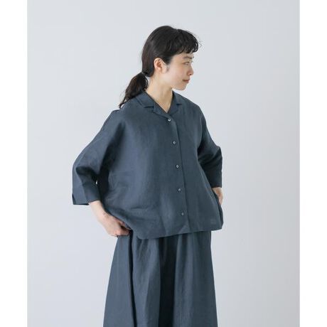 日々のスタイリングに重宝する開襟シャツ。やや太めの半端袖は、気になる部分をカバーしつつ涼しい着心地。カジュアルながらもきちんとした佇まいでどこか上品な雰囲気をまとっています。ループ付きのオーブンカラーはボタンを上まで留めるとレギュラーカラーとしても着用可能。バランスが取りやすい丈なのでスカートにもパンツにも好相性です。前を開けて羽織りのスタイリングにも活躍します。定番のBLACKに加え、中々他には無いBROWN・BLUE GREENの洗練されたカラーにも注目。シンプルなトップスが映え、お出かけ気分を高めてくれるアイテム。同素材のスカートを合わせてワンピース見えする着こなしもおすすめです。