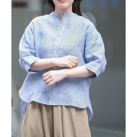 適度にゆるめに設定したサイズ感がラフな印象をプラスし、こなれ感溢れるバンドカラーと長くしすぎない着丈、裾のラウンドヘムを採用。