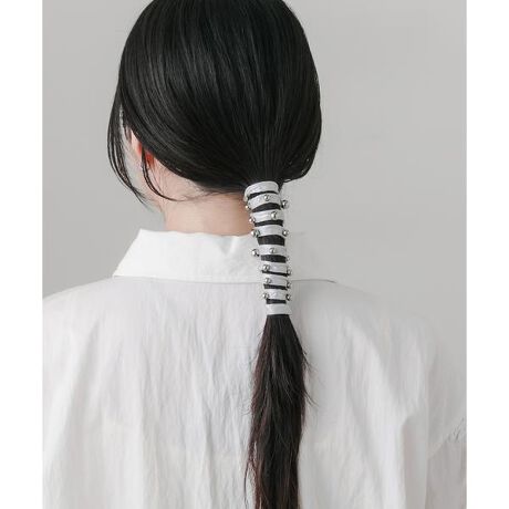 柔らかなリボンのような素材にメタルボールが並んだ珍しいデザインで、カジュアルな中にもエッジの効いたアクセントを添えてくれます。