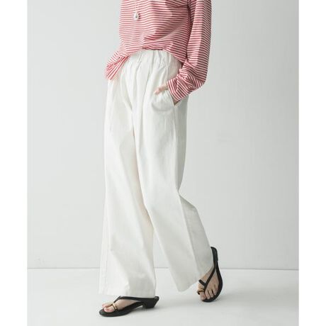 ウエストは総ゴムのギャザー仕様でリラクシーな穿き心地ながら、フロントはファスナー開きにすることで、トップスをインした際もすっきりと上品に決まるデザインに。内側の紐でサイズ調整も可能です。