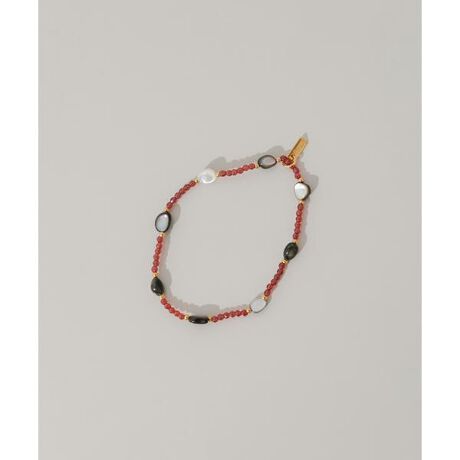 こっくりとした赤色のビーズに、モノトーンのシェルを組みわせた、どこかヴィンテージライクな雰囲気のブレスレット。