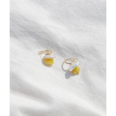 つやつやとしたパールの光沢と、天然石風のイエローパーツが組み合わさったフープピアス。