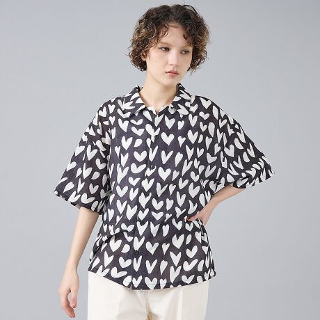 イラストタッチなハート柄を全面にあしらった、存在感たっぷりのRevo.の総柄シャツ。
