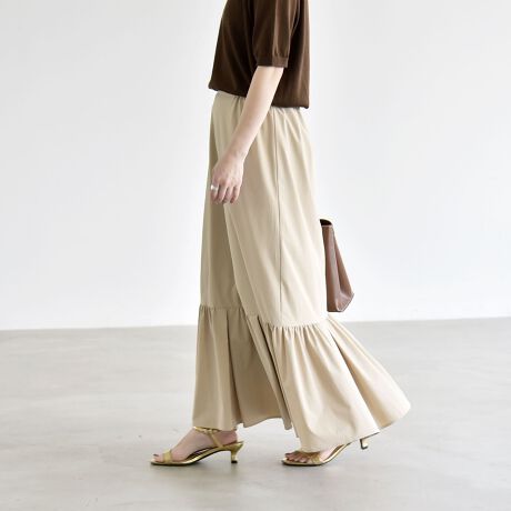 裾に切り替えを施したティアードデザインが印象的なロングスカート。