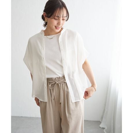 ほどよいシアー感が魅力のブラウスを、着こなしやすいドルマンシルエットできれいめ見えするデザインに。