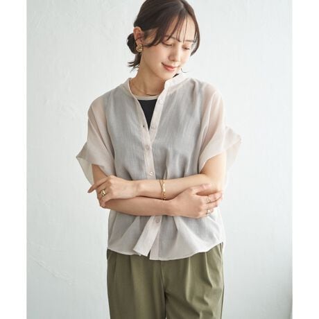 ほどよいシアー感が魅力のブラウスを、着こなしやすいドルマンシルエットできれいめ見えするデザインに。