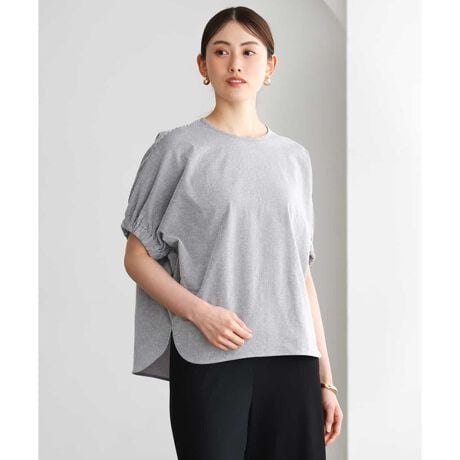 表面感のあるジャージーサッカー素材を使用したドルマンスリーブカットソー。凹凸のある生地を活かし、袖口にゴムギャザーを施すことで、ふんわりと身体から離れる立体的なシルエットに仕上げました。涼しげな印象で、一枚で着映える主役級アイテムです。