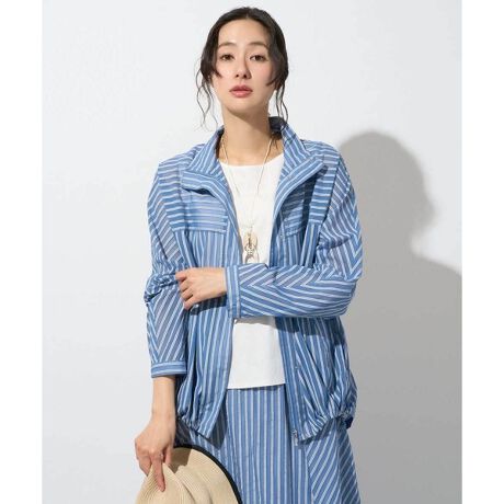 ・シアーな形状記憶の先染ストライプ生地を使用したスタンドカラーのジップアップブルゾンです。