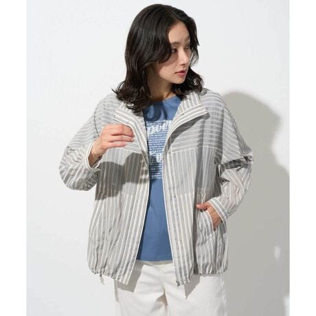 ・シアーな形状記憶の先染ストライプ生地を使用したスタンドカラーのジップアップブルゾンです。
